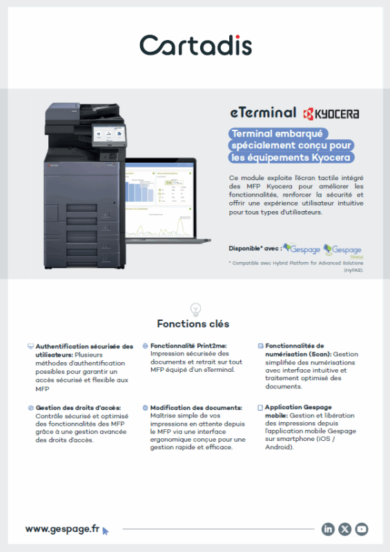 Le eTerminal Gespage pour MFP Kyocera permet la mise en place de la solution de gestion des impressions sécurisée Gespage en s'intégrant parfaitement aux multifonctions Kyocera. Offrant un contrôle d'accès complet, une impression sécurisée mobile "Print2me"" (appelée également "pull-printing", "print release" ou "impression sécurisée"), le eTerminal Gespage permet d'améliorer la sécurité, de gérer et de simplifier l'accès aux fonctionnalités d'impression, tout en assurant une réduction des coûts d'impression et de l'impact sur l'environnement.