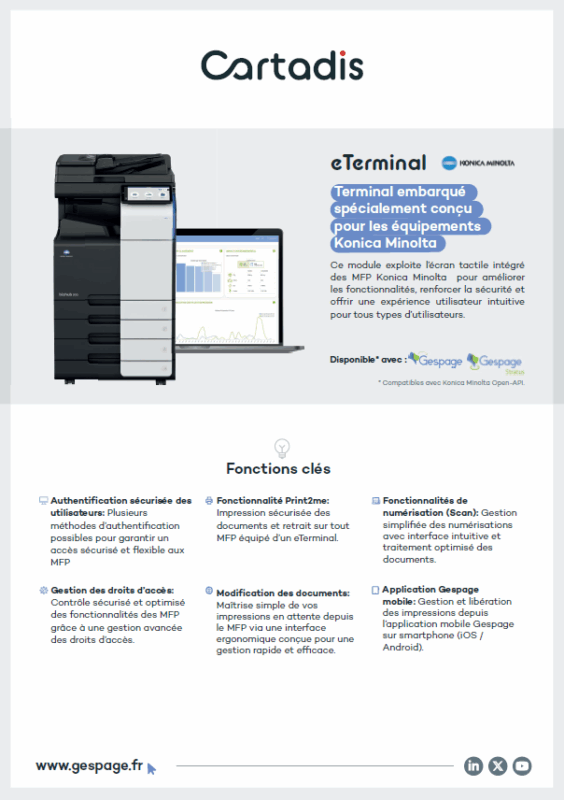 Le eTerminal Gespage pour MFP Konica Minolta permet la mise en place de la solution de gestion des impressions sécurisée Gespage en s'intégrant parfaitement aux multifonctions Konica Minolta. Offrant un contrôle d'accès complet, une impression sécurisée mobile "Print2me"" (appelée également "pull-printing", "print release" ou "impression sécurisée"), le eTerminal Gespage permet d'améliorer la sécurité, de gérer et de simplifier l'accès aux fonctionnalités d'impression, tout en assurant une réduction des coûts d'impression et de l'impact sur l'environnement.